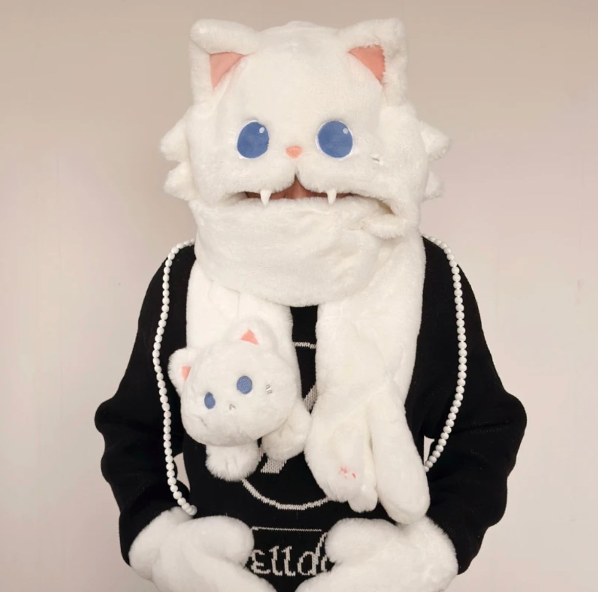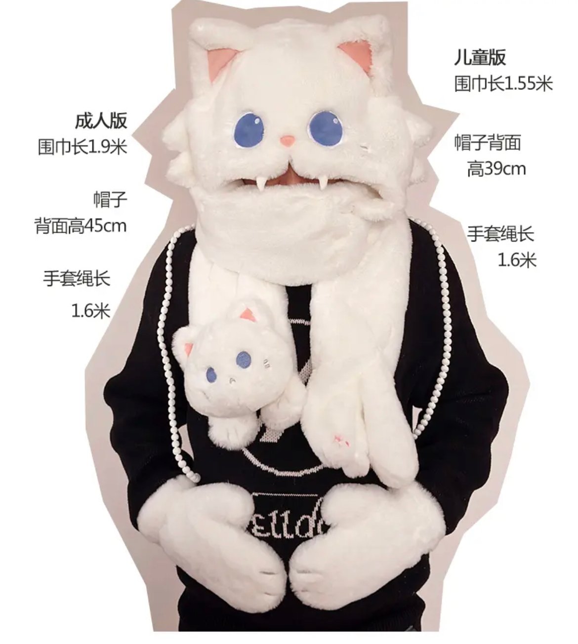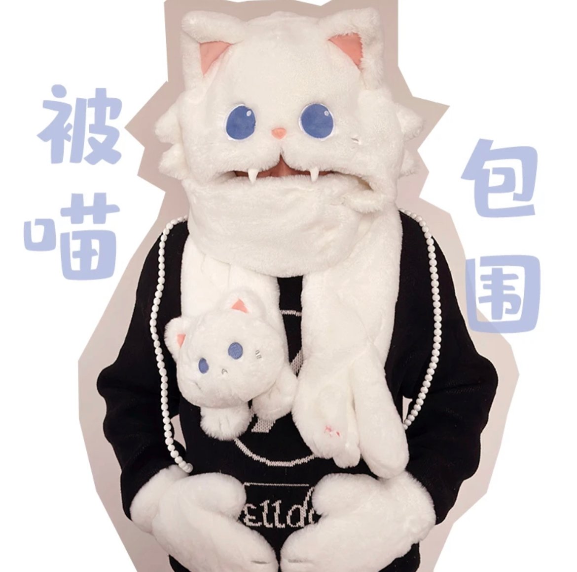ollig·可愛貓咪圍脖帽子手套一體毛絨保暖百搭連帽圍巾冬季女生禮物